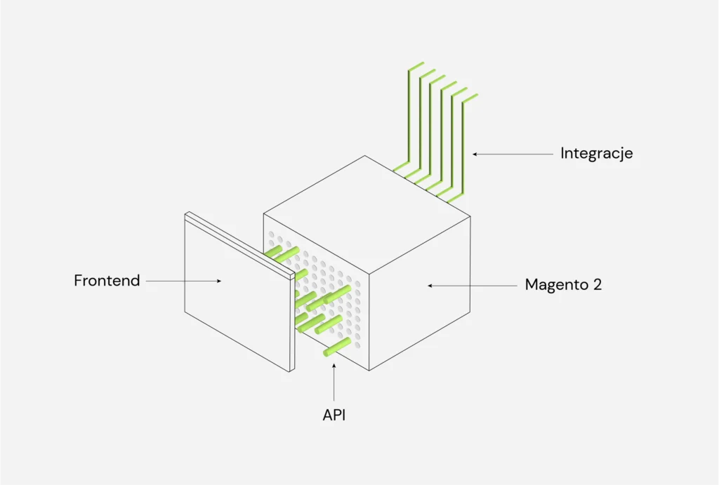 - Magento jest całkowicie odseparowane od warstwy frontowej poprzez wprowadzenie dedykowanego API które służy za proxy pomiędzy warstwą frontową a backendową. Wszystkie requesty które chcą pobrać zasoby z Magento są tłumaczone i filtrowane poprzez API które następnie w swój sposób łączy się z Magento,